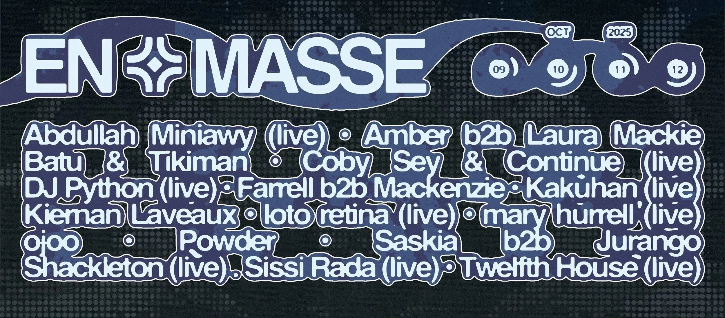 En Masse 2025 is back in Bristol this 9-12 October 2025: bigger, bolder, and unapologetically underground. We’re celebrating our 5th anniversary with a 4 day music programme that merges electronic music, live performance, and collaborative art across five Bristol venues. A wave of sonic chaos.